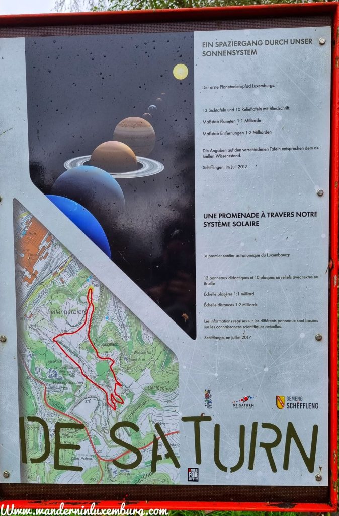 Leicht zu gehender Wanderweg mit sehr viel Ruhe. Nur einmal kurz Treppen runter gehen, ansonsten nicht viele Höhenunterschiede. Dieser Spaziergang durch unser Sonnensystem enthält 13 Sichtafeln und 10 Relieftafeln.