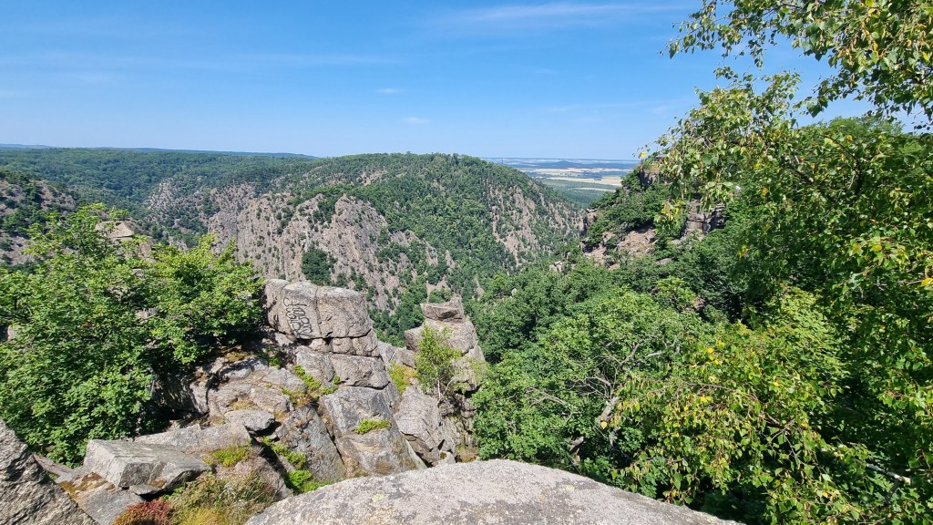 Unsere Wanderung führte uns über schmale, teilweise steile Pfade – stets begleitet vom Rauschen des Waldes und spektakulären Ausblicken auf das Bodetal. Wer diesen Weg geht, sollte gut zu Fuß sein, denn die Strecke verlangt Trittsicherheit und verläuft über felsige, teils unebene Abschnitte. Feste Wanderschuhe sind hier kein Luxus, sondern eine Notwendigkeit, um sicher und entspannt die beeindruckende Umgebung zu genießen.