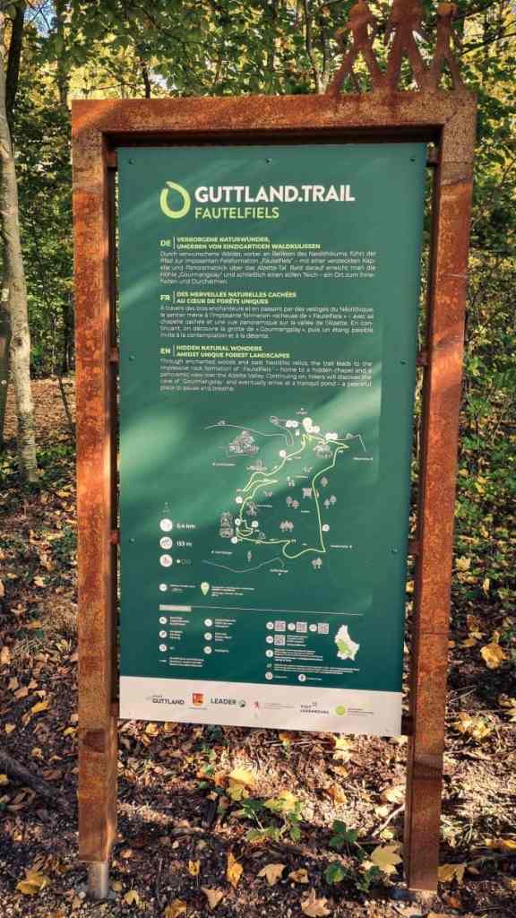 Ein vielseitiger Wanderweg, der vollständig durch den Wald führt. Die Route kombiniert schmale Pfade, breitere Wege und einige Treppenabschnitte. Entlang des Weges liegen mehrere sehenswerte Punkte: der historische Ort „Neolithikum“, die markante Felsformation Fautelfiels mit ihrer kleinen, in den Felsen eingebetteten Kapelle und dem Ausblick über das Alzette-Tal, die Felshöhle Gourmangslay sowie ein idyllischer Teich, der sich perfekt für eine kurze Rast eignet.